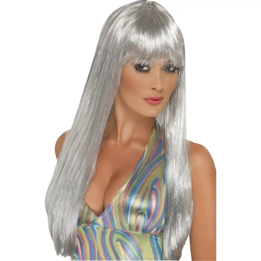 Longue perruque lisse avec frange parsemée de paillettes, pour femme ou adolescente. Avec cette perruque, vous pourrez vous déguiser en star, en danseuse disco ou en danseuse de cabaret.