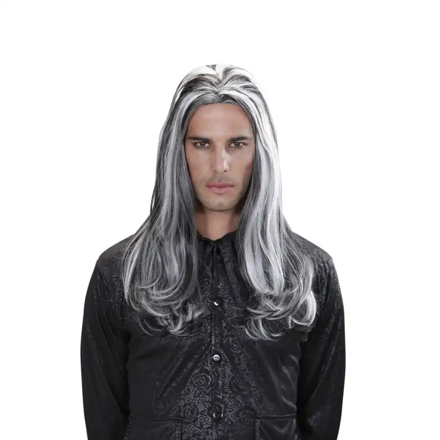 La longue perruque blanche et noire de vampire est le complément idéal pour un costume de vampire lors d’une fête sur le thème de l’horreur.