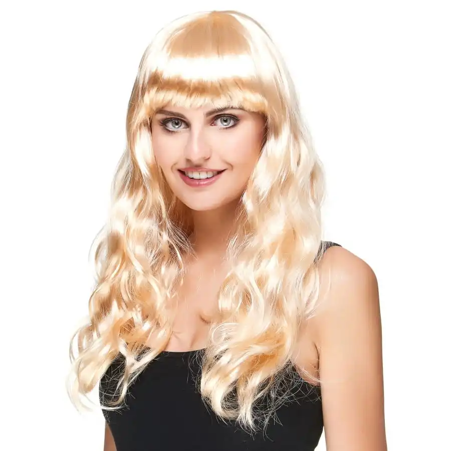 Belle allure et belle chevelure vont de pair ! Métamorphosez-vous en star du box-office avec cette longue perruque blonde légèrement ondulée, frange. Beaucoup de brillance, de légères ondulations, une longueur parfaite qui dépasse les épaules, de magnifiques reflets dorés et un peu de volume, que demander de plus ? Cette coiffure à franges sera la bienvenue pour une soirée habillée.