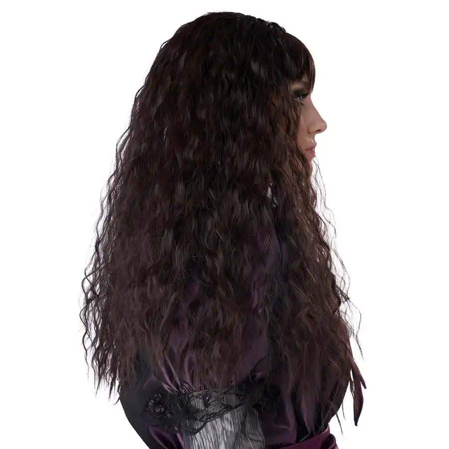 Il s’agit d’une perruque constituée de longues mèches de cheveux synthétiques.
