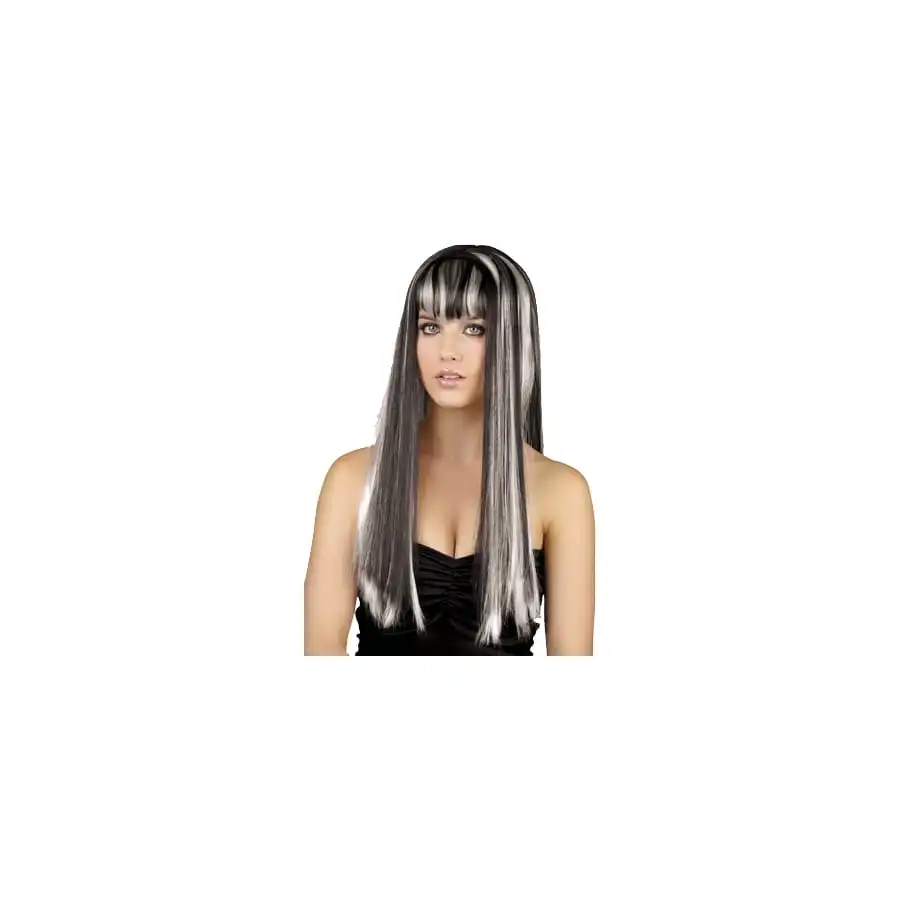 Perruque “MĂ©dĂ©a” pour femme. Cet accessoire est constituĂ© de longs cheveux lisses mĂ©chĂ©s noirs et blancs, avec une frange assortie. Cette perruque vous permettra de vous dĂ©guiser en personnage fantastique ou mythologique.