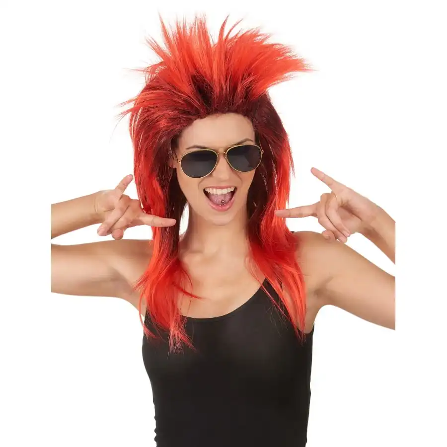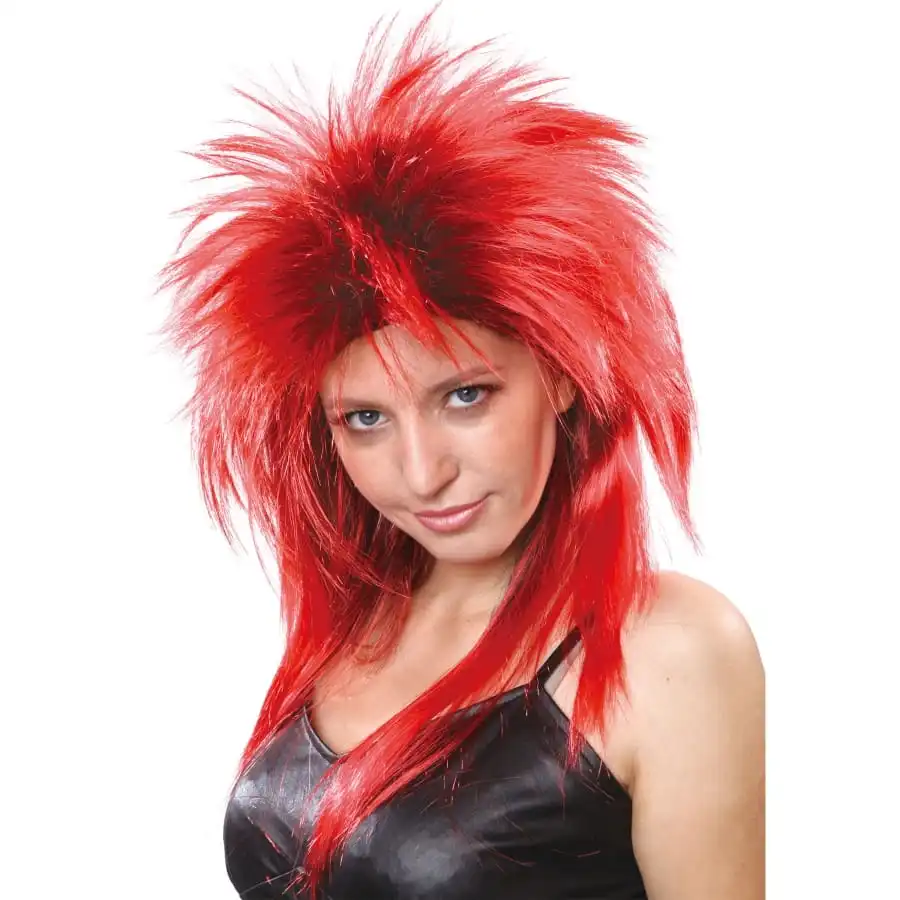Pour un look rock’n roll réussi, coiffez vous de cette longue perruque rock star rouge aux racines noires pour femme.