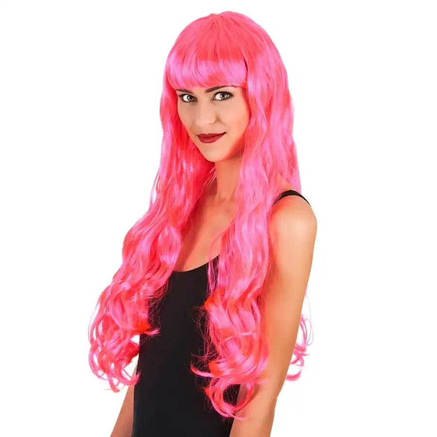 Nous vous suggérons cette longue perruque rose ondulée avec frange droite pour agrémenter toutes sortes de tenues lors des carnavals ou des soirées Conte de fée ou Science-Fiction.