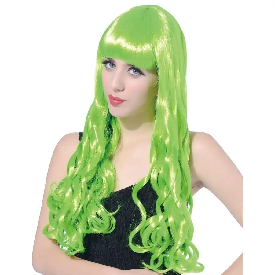 La perruque présente des mèches de cheveux ondulées et soyeux de couleur vert fluo, avec une frange qui vous recouvrira le front.