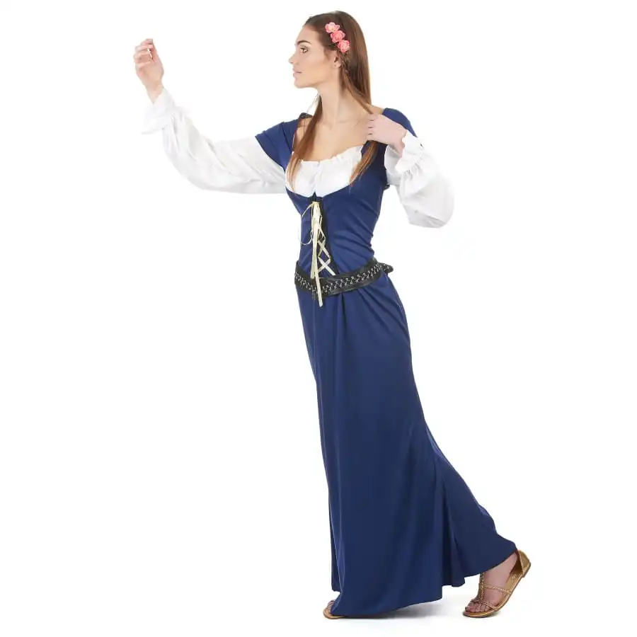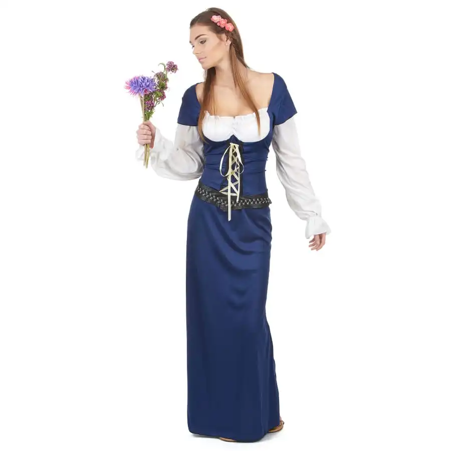 Avec cette longue robe bleue de bavaroise pour femme, mettez-vous dans la peau d’une belle Allemande pour l’une de vos soirées déguisées. La tenue est faite d’une fausse chemise blanche décolletée couvrant la poitrine, et d’une longue robe bleue marine avec des manches courtes. La robe est cintrée par un haut de type corset, qui se resserre avec un lacet doré, puis de longues manches blanches prolongent celles de la robe pour donner l’effet fausse chemise. Elle est décorée d’une ceinture noire tombante à la taille. Les fronces de la fausse chemise au niveau des poignets et de la poitrine donneront du charme à la tenue.
