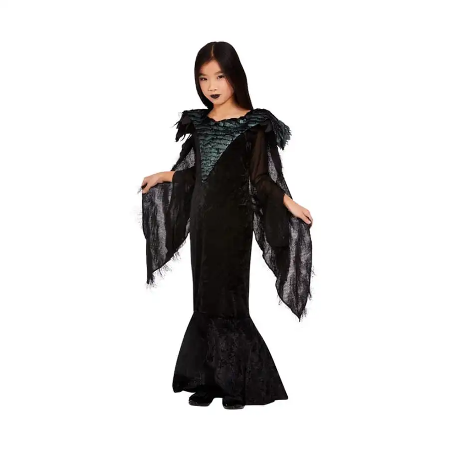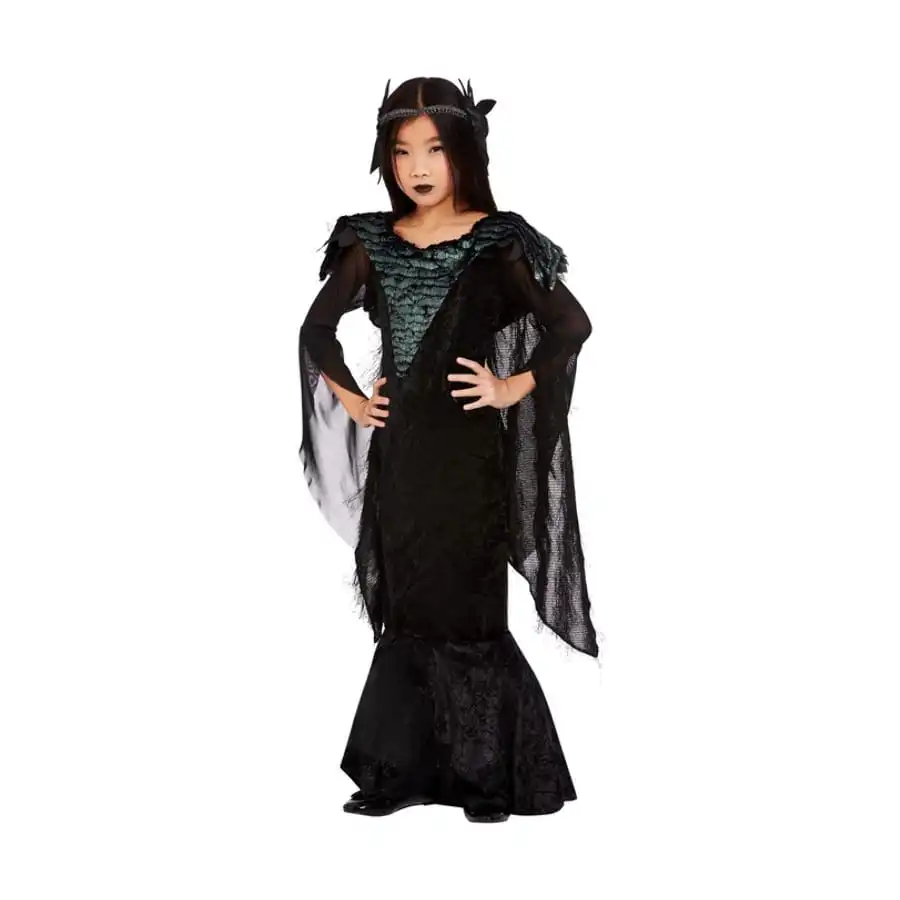 Cette Longue robe noire de reine des corbeaux pour fille sera parfaite pour déguiser votre petite fille pour le prochain halloween.