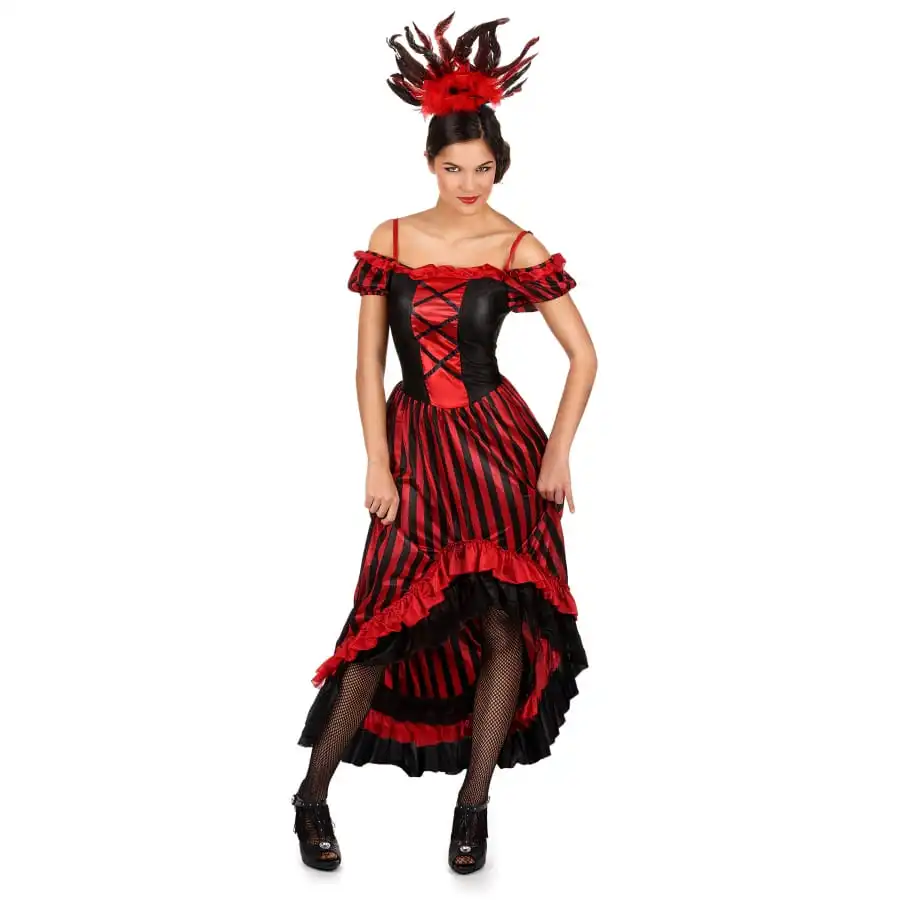 Copiez le look des belles danseuses dans les films westerns. Que diriez-vous de devenir une irrĂ©sistible sĂ©ductrice dans une tenue Ă la fois chic et voyante. Laissez-vous enivrer par la splendeur de cette longue robe noire et rouge de danseuse de cabaret. Il s’agit d’un modĂšle en tissu satinĂ© de couleur rouge et noire, Ă©quipĂ©e d’un corsage avec faux lacet cousu sur le devant. La robe est dotĂ©e de fines bretelles rouges et de manches bouffantes qui laissent les Ă©paules dĂ©nudĂ©es. Les manches affichent des rayures verticales rouges et noires. Le bas de la robe est Ă©galement rayĂ© de rouge et de noir, et agrĂ©mentĂ© de volants noirs. Des collants en rĂ©sille et une paire de talons hauts seront parfaits pour vous mĂ©tamorphoser en danseuse charleston.