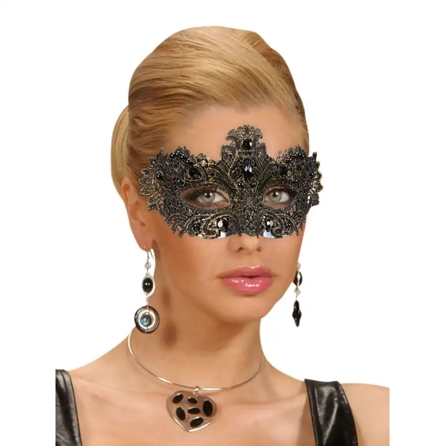 Il est question d’un loup en plastique sur lequel est placé de la dentelle noire sur toute la surface.