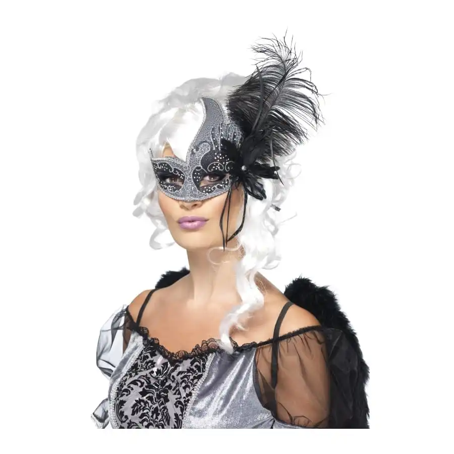 On vous appellera : la mystérieuse femme élégante du bal masqué ! Un simple masque peut vous conférer un caractère. Celui que nous vous suggérons est un ravissant masque de couleur noire argentée. Les mots ne suffisent pas pour dire à quel point ce masque est resplendissant ! Il est magnifiquement orné de gris et porte une plume noire sur le côté. Vous pourrez l’attacher derrière, grâce à une ficelle. Soyez sûre que cet accessoire vous attribuera une beauté incroyable !