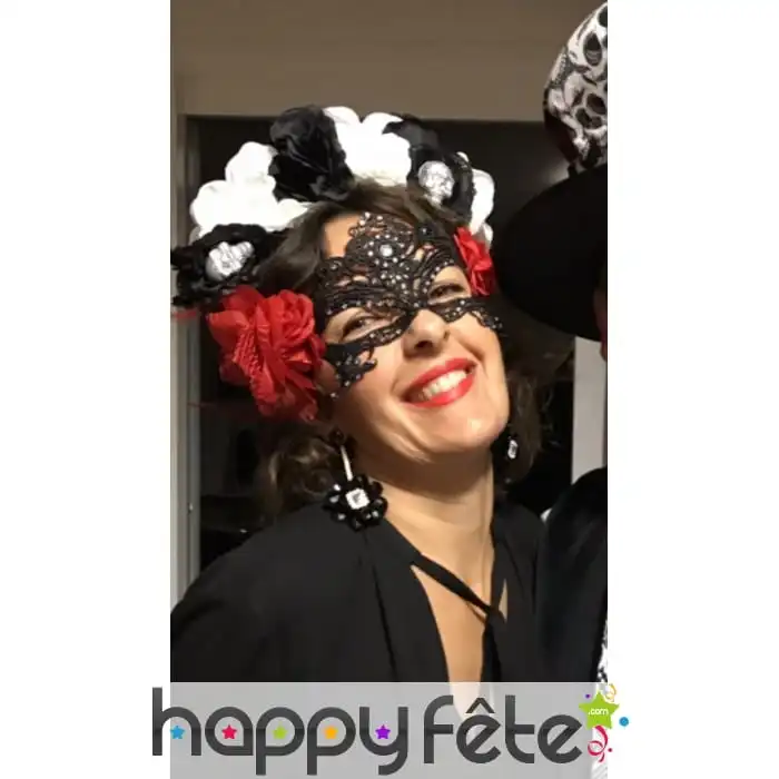 Un masque peut tout changer, surtout s’il est d’une grande beauté ! Vous allez vite être séduites par ce loup noir filigranes et brillants, jour des morts. Ce modèle à motifs en filigrane est de couleur noire avec des fausses pierres brillantes en ornement. De magnifiques roses rouges en tissu ont été intégrées de chaque côté du masque.