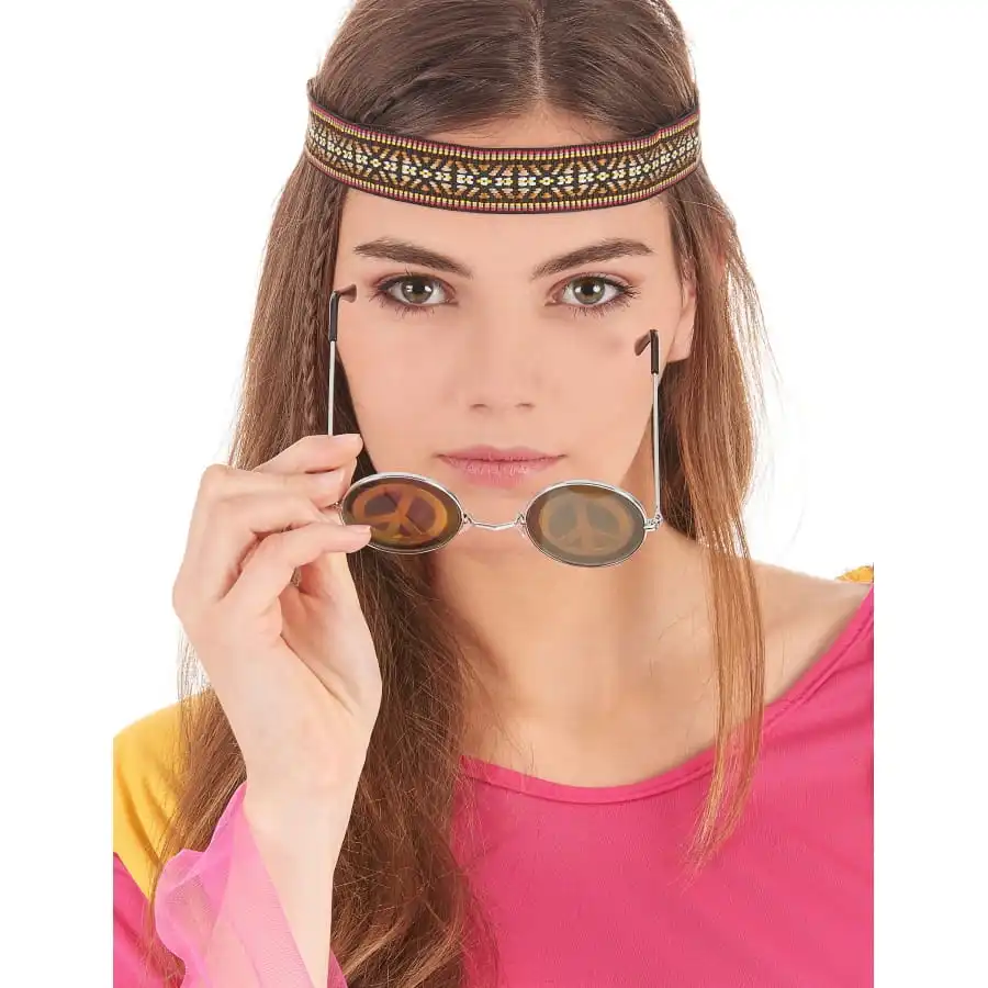 Pour finaliser votre look de hippie lors des fêtes costumées, nous vous suggérons ces lunettes rondes avec symbole peace and love sur notre site de vente en ligne.