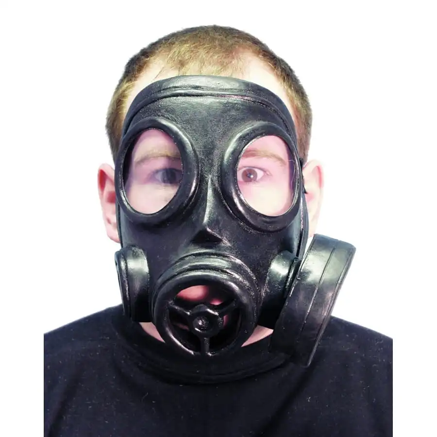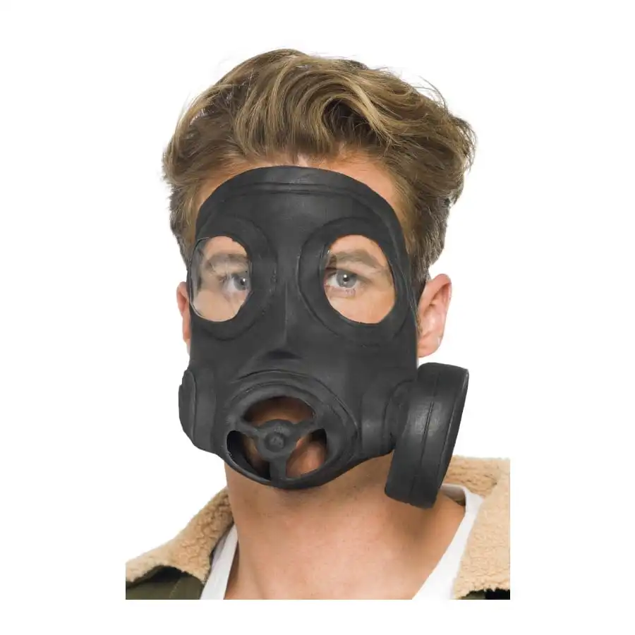 Masque à gaz en plastique de couleur noire. Cet accessoire est idéal pour compléter un déguisement sur les thèmes d’action et d’aventure.