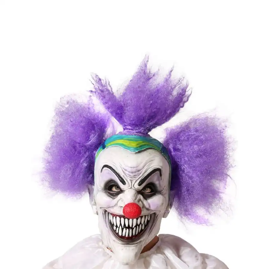 Finalisez un costume sinistre d’Halloween en arborant le masque de clown fou avec cheveux violet, adulte.