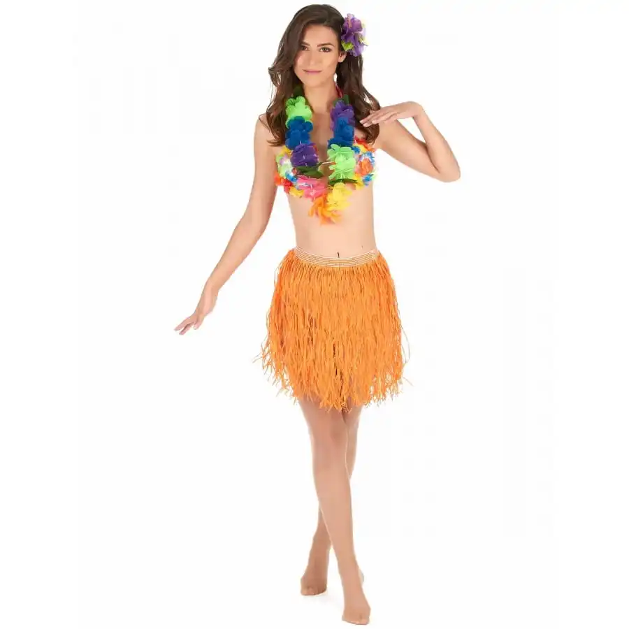 Cette courte jupe hawaïenne est faite de tiges de papier torsadés de couleur orange avec un élastique à la taille qui s’adapte à votre silhouette.