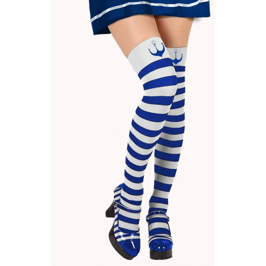 Le bateau va bientôt jeter l’ancre ! Etes-vous prête pour cette nouvelle aventure ? Equipez-vous de la bonne façon avant de vous faufiler sous la peau d’un officier de la marine. Cette paire de bas marins rayés bleus blancs est l’accessoire qu’il vous faut pour compléter votre déguisement. Les bas sont très longs, rayés de bleu et de blanc, et ornés d’un imprimé ancre sur le sommet.