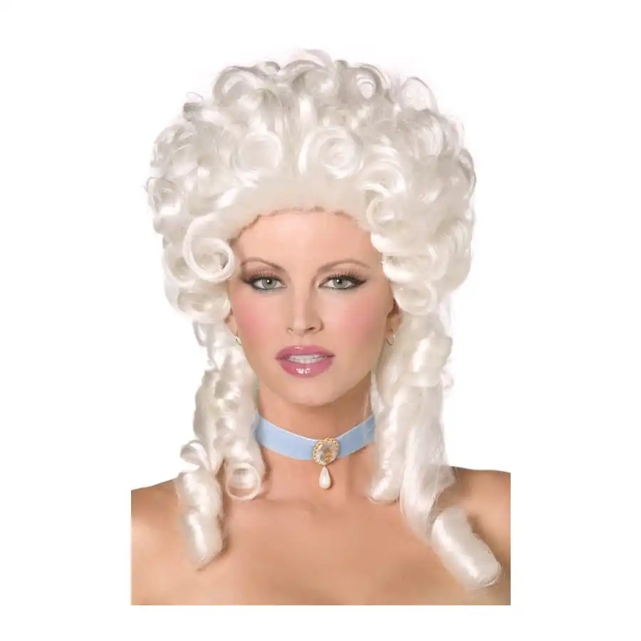 Perruque baroque de couleur blond platine pour femme. Cet accessoire est composé d’une multitude de boucles très soigneusement coiffés en un chignon avec des mèches sur le cou. Utilisez-la pour un déguisement de marquise ou de personnage médiéval.