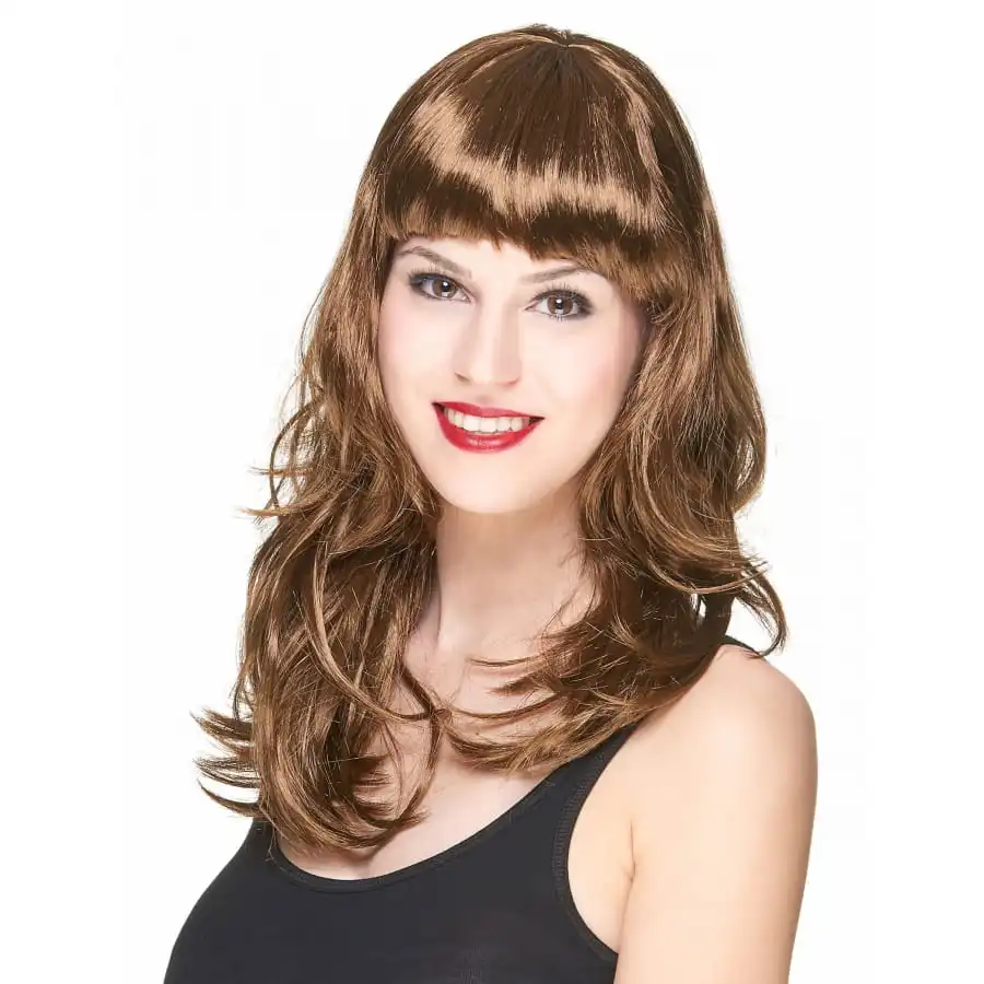 Nouveau look, nouvelle tête et nouvelle couleur ! Renouvelez votre coiffure en l’espace de quelques secondes rien qu’en enfilant la perruque châtain mi-longue à frange droite. Elle est dotée d’un filet élastique permettant un bon maintien. Sa belle couleur châtain foncé brille de mille éclats ! La longueur de la perruque dépasse les épaules et la frange couvre tout le front.