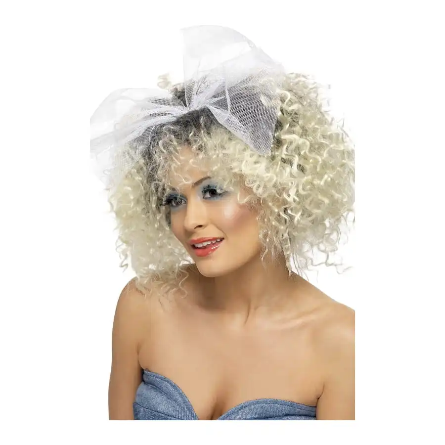 Perruque frisée avec voile inspirée du look de Madonna pendant les années 80. Cet accessoire pour femme est de couleur blond et le voile est blanc. Rendez votre tenue de célébrité inoubliable avec cette magnifique perruque.
