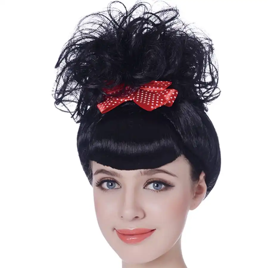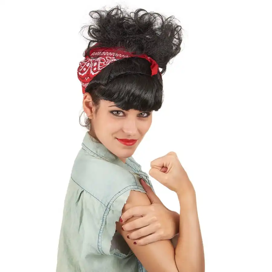 Cette Perruque noire années 50 avec foulard rouge est l’accessoire idéal pour compléter votre costume rétro style années 50.