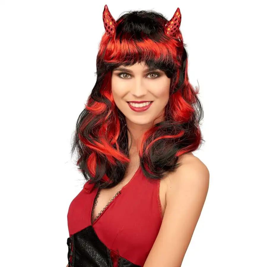 La perruque noire et rouge avec cornes pailletées pour femme est faite de cheveux synthétiques.