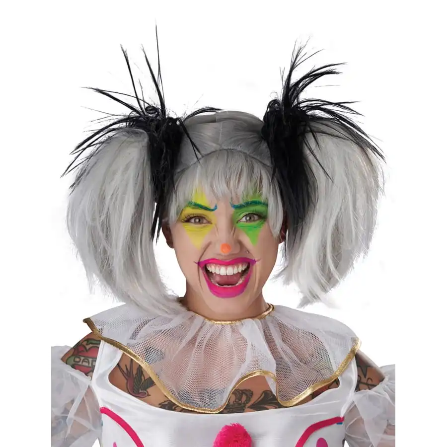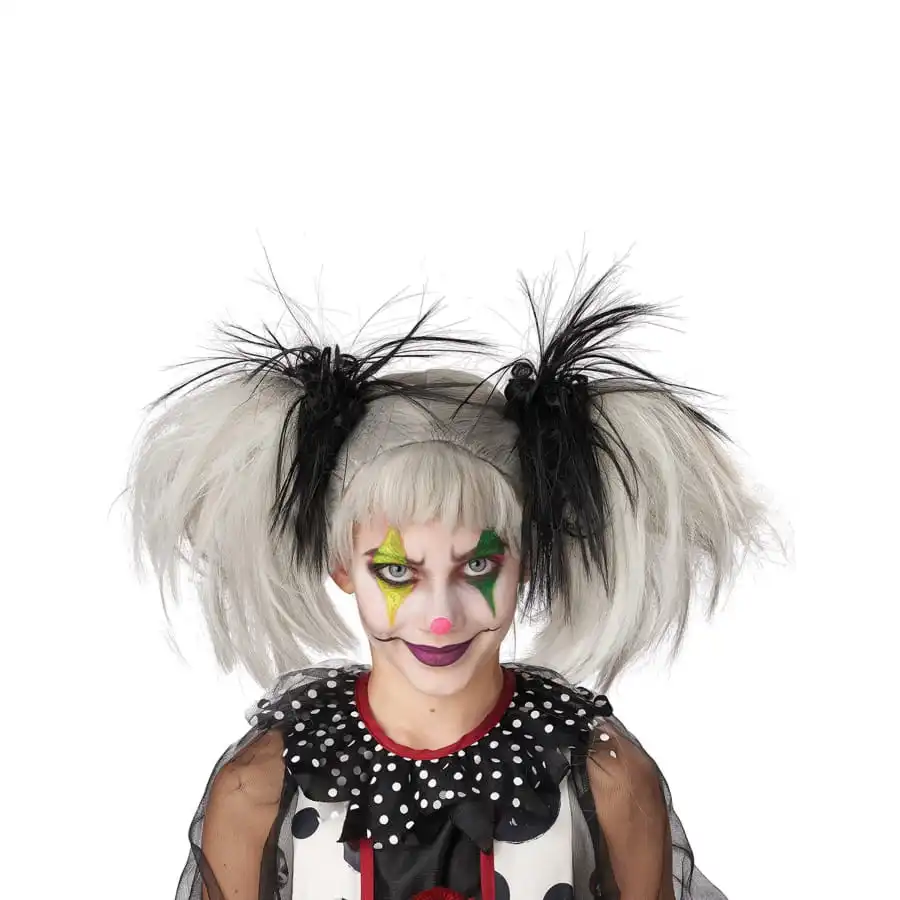 On retrouve une perruque accompagnée de deux couettes de couleur argentée à la lumière.