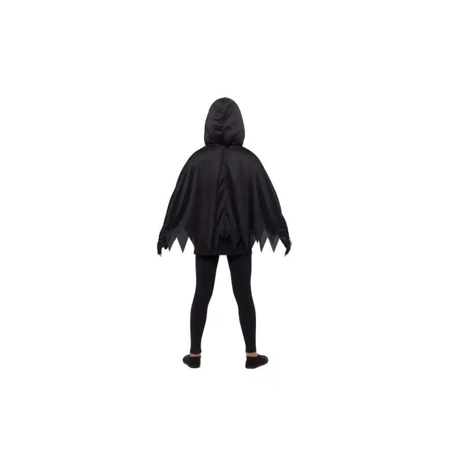 L’accessoire est composé d’un poncho noir, imprimé d’un squelette blanc et terminé en dents de scie, d’une paire de gants noir, présentant également une impression de squelette.