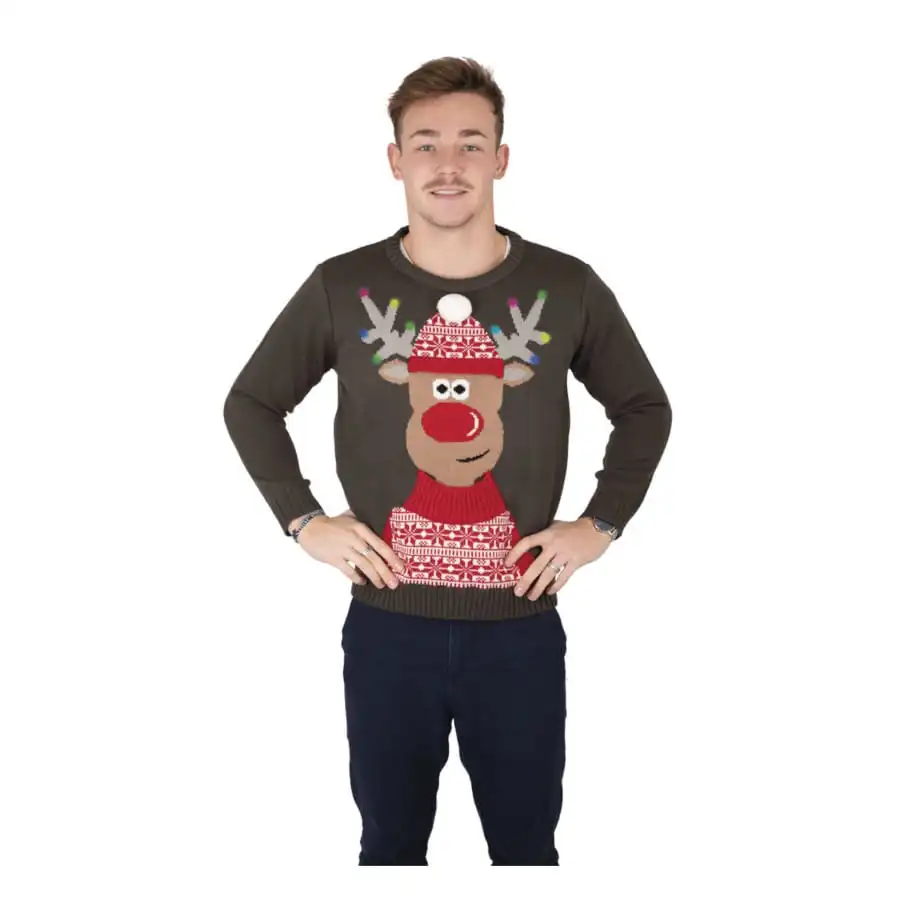 Entrez dans la période des fêtes de fin d’année avec humour et joie de vivre en arborant le pull de Noël renne lumineux et sonore.