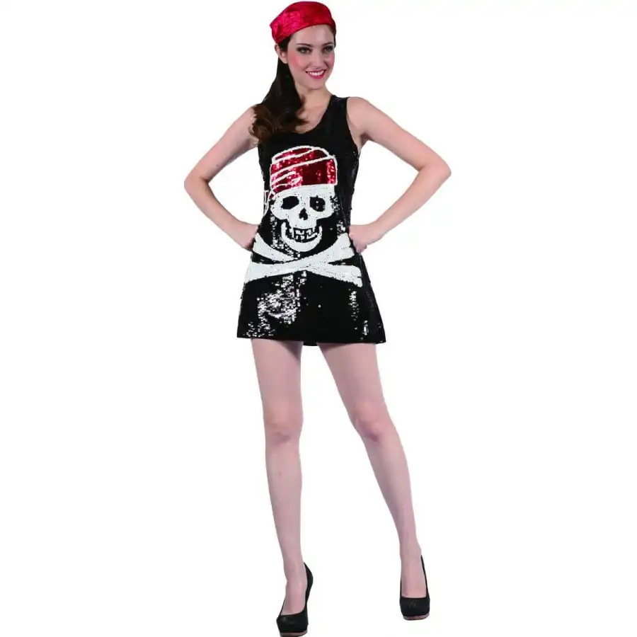 Nous vous proposons une robe à sequins imprimée de tête de mort.