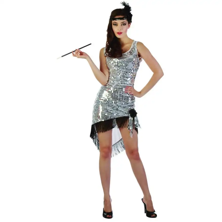 Cette robe charleston asymétrique argentée à sequins saura mettre en valeur votre silhouette.