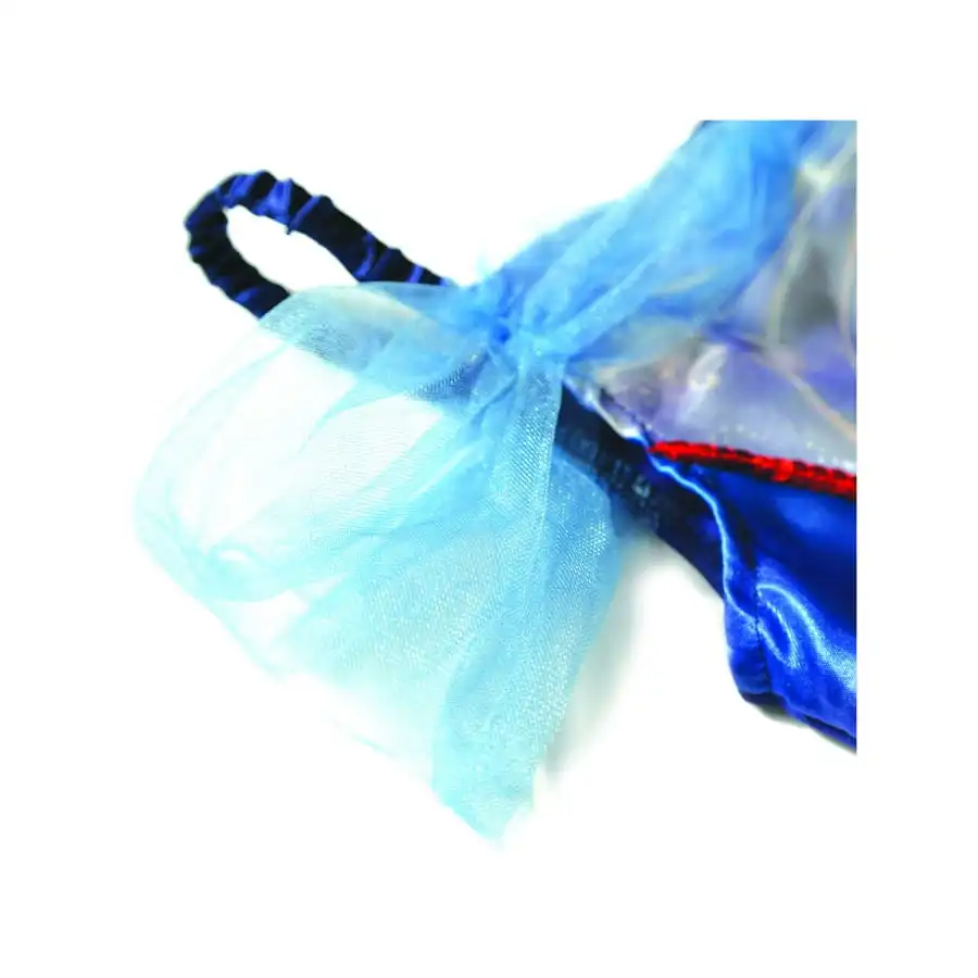 Elle possède un corsage satiné bleu avec des petites manches en voile.