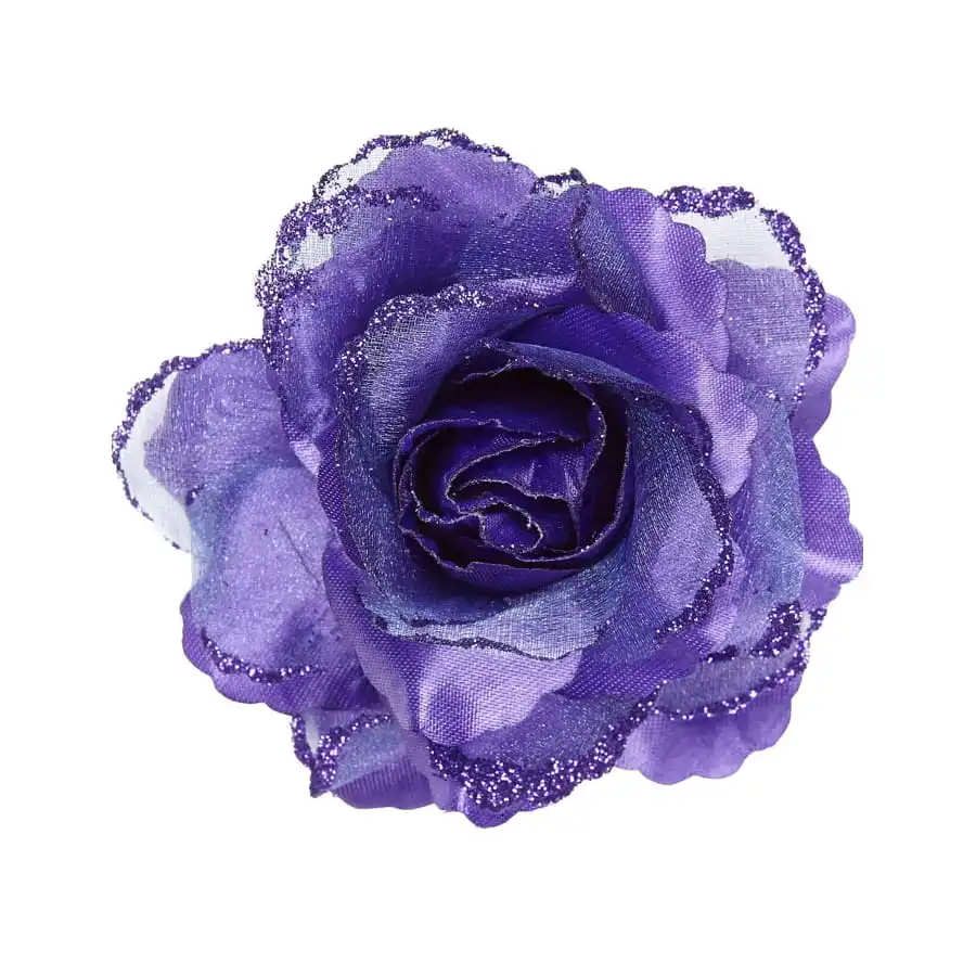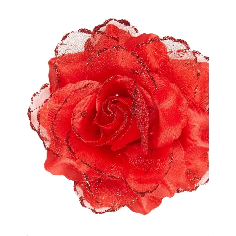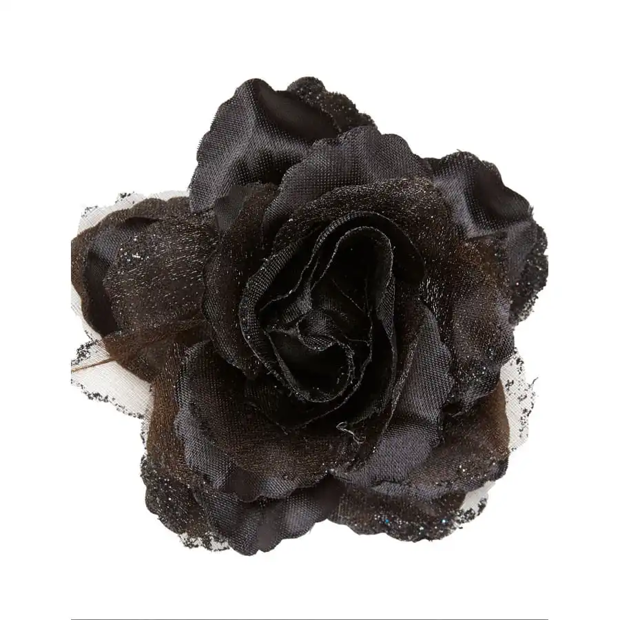 La rose pour cheveux de 10 cm est montée sur une barrette avec une petite pince métallique.