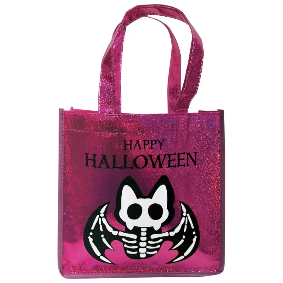 C’est un sac rose pailleté portant en motif le squelette blanc d’une chauve-souris sous l’inscription “Happy Halloween”.