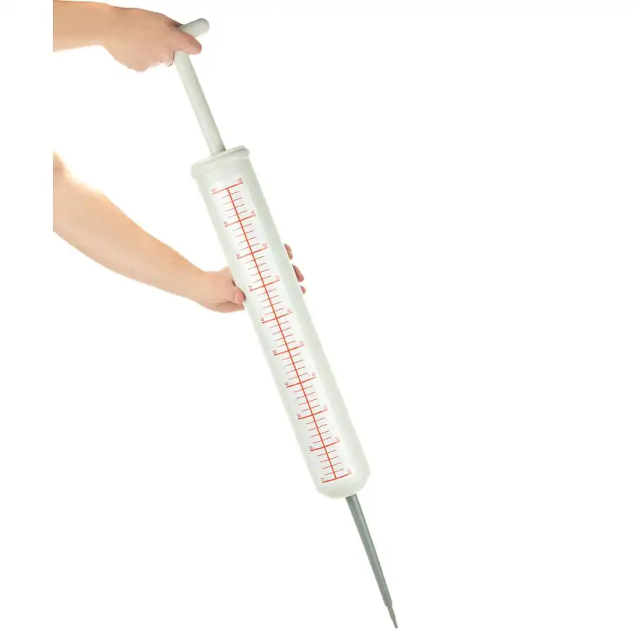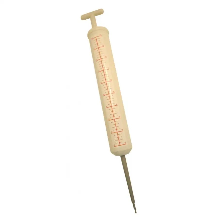 Constituée de plastique, cette seringue de 125 cm de long est composée de trois parties dont une centrale possédant un autocollant rouge et blanc.