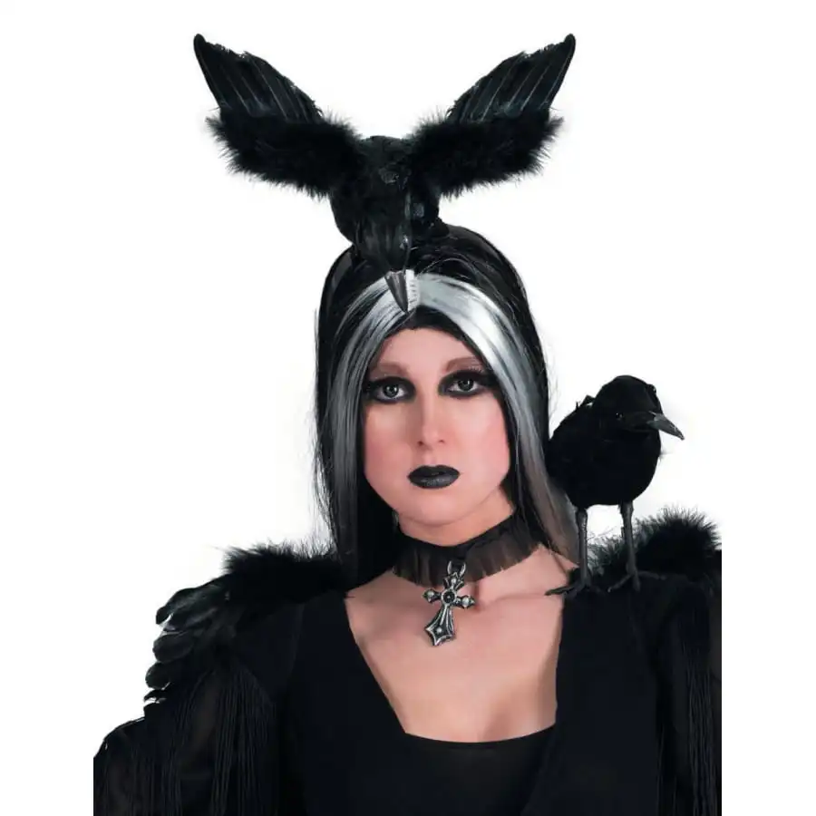 Assez intriguant, ce serre-tête noir met en avant un corbeau en fausses plumes noires qui semble déployer ses ailes pour s’envoler.
