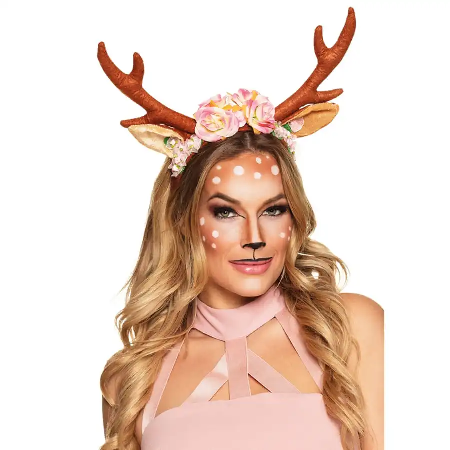 Cette coiffe est un joli assortiment de cornes de cerf marron, d’une paire de grandes oreilles ainsi qu’une couronne de fleurs roses.