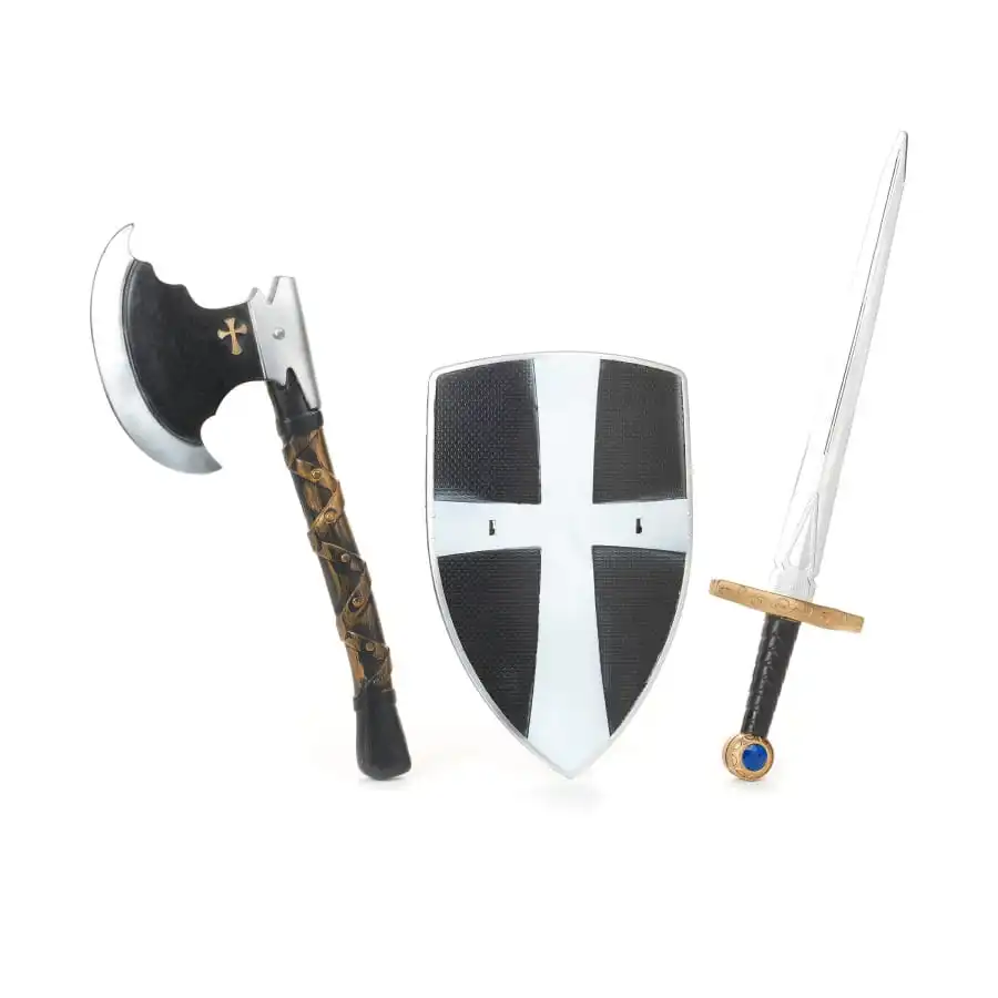 Il est primordial de savoir se défendre lorsqu’on intègre le rang des chevaliers. Munissez-vous des meilleures armes en vous procurant ce set bouclier, épée et hache médiévale en plastique, de couleur noire et blanche. Il comprend une épée de 50 cm de dimension, accompagnée d’une hache faisant 36 cm. Recevez également un bouclier mesurant 30 cm par 20 cm équipé d’une attache pour une bonne prise en main.