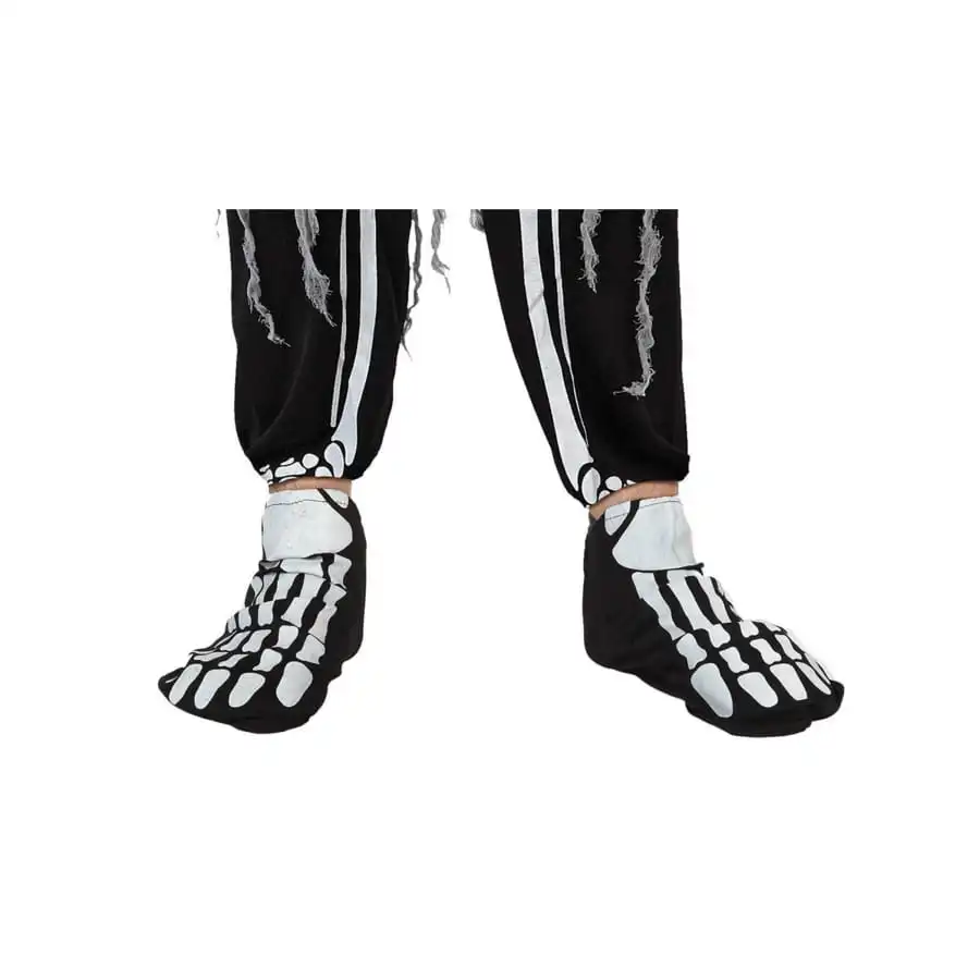Il s’agit d’une paire de sur-chaussures de couleur noire, sur laquelle est imprimée en blanc des pieds de squelette.