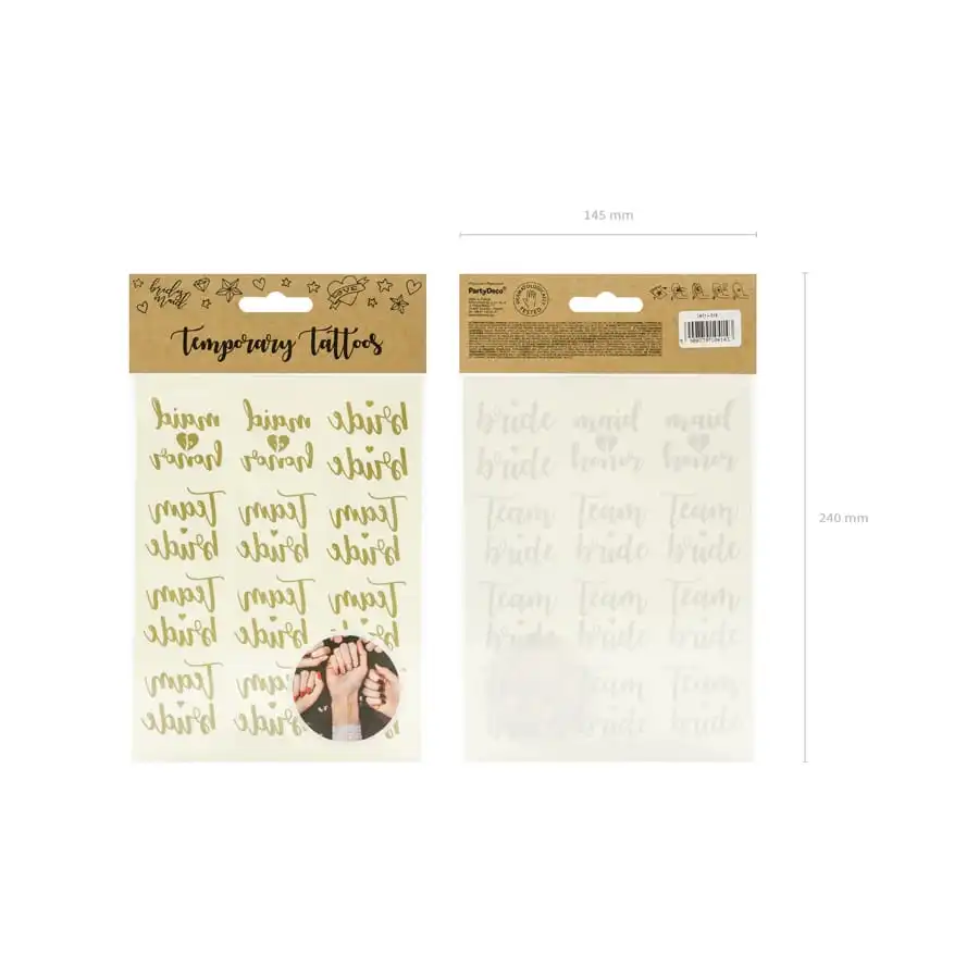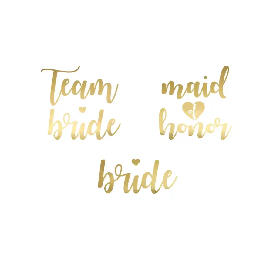 Parmi les 13 tatouages fournis, vous trouverez des inscriptions “bride” (x2), team bride (x9) et maid of honor (x2).