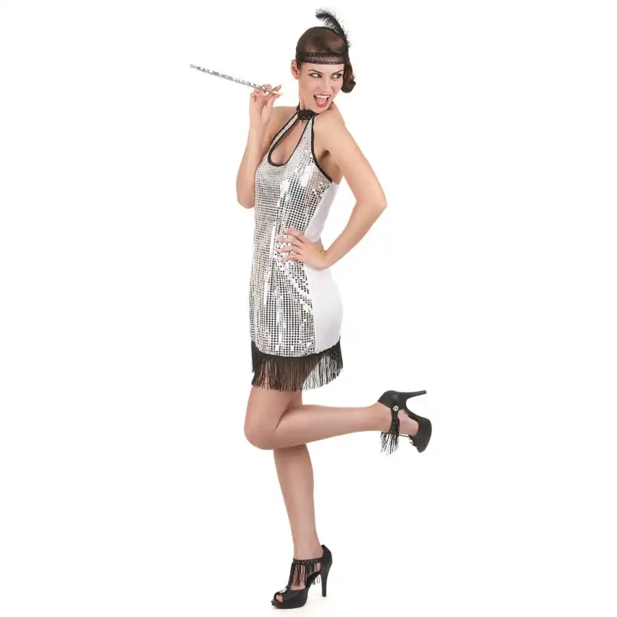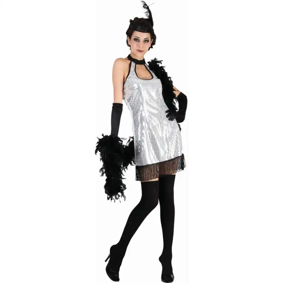Brillez de mille feux avec cette tenue courte disco argentée avec sequins, Mesdames ! La tenue se compose d’une robe grise argentée, courte, allant jusqu’à mi-cuisse. Elle est à dos nu, des bretelles se fixent sur un genre de col mao noir, celui-ci se refermera à l’arrière de la nuque par un scratch. La robe est agrémentée de sequins brillants et le bas est bordé de fines franges noires ; les bretelles, quant à elles, sont bordées d’un fin liseré noir. Un bandeau transparent noir, à élastique, orné de sequins brillants et d’une plumette noire, soulignera votre coiffure. Nous vous conseillons de porter un boa à plumes noires pour compléter votre tenue.
