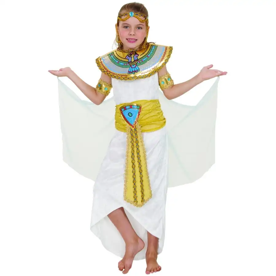 Inspirez-vous de la culture égyptienne afin de dénicher un look original pour votre petite fille. A l’occasion de son goûter d’anniversaire, transformez-la en mini Cléopâtre grâce à cette tenue de petite égyptienne pour fille. Elle sera revêtue d’une robe blanche effet velours, sans manches, longue à l’arrière et plus courte devant. Des pièces de tulle bleu clair ont été intégrées à la robe, avec des élastiques à passer aux doigts sur les deux extrémités. Elles vous feront penser à une traine. Une ceinture à scratcher couleur or, agrémentée d’un petit plastron est fournie pour souligner la taille. Le symbole de l’oeil divin a été reproduit juste au centre de la ceinture. La robe est accompagnée d’une collerette en tissu plastifié, à nouer derrière le cou. Ornée d’une représentation aigle, elle est destinée à recouvrir les épaules. Une paire de manchons viendra accessoiriser la tenue. Chaque manchon est doré et orné d’une fausse pierre bleue. Il se fixe au bras à l’aide de scratch. Découvrez aussi un léger bandeau couleur or et décoré d’une fausse pierre bleue. L’accessoire est équipé d’un élastique pour faciliter son utilisation.
