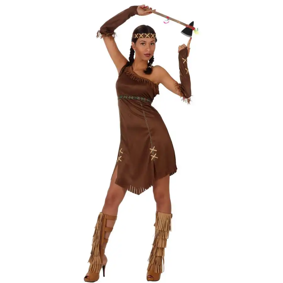 Interprétez le rôle d’une charmante amérindienne lors d’une soirée à thème western. Vous ne manquerez pas d’originalité dans cette tenue marron unie d’indienne pour femme adulte. Le déguisement est formé par une robe à franges de couleur marron. Elle est agrémentée de quelques liserés dorés. Sa coupe est très stylée, avec une seule bretelle ainsi que des petites fentes sur le bas. Elle est faite pour mettre en valeur votre silhouette. Une paire de manchons de couleur assortie viendront couvrir vos avant-bras. Optez pour une coiffure assez traditionnelle avec des nattes. Vous disposerez d’un bandeau marron pour apporter la touche amérindienne. Retrouvez du maquillage, des armes d’indiens et toutes sortes d’accessoires sur notre site happyfete pour compléter au mieux votre costume.