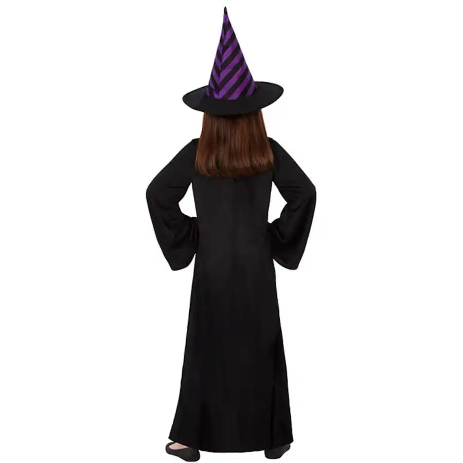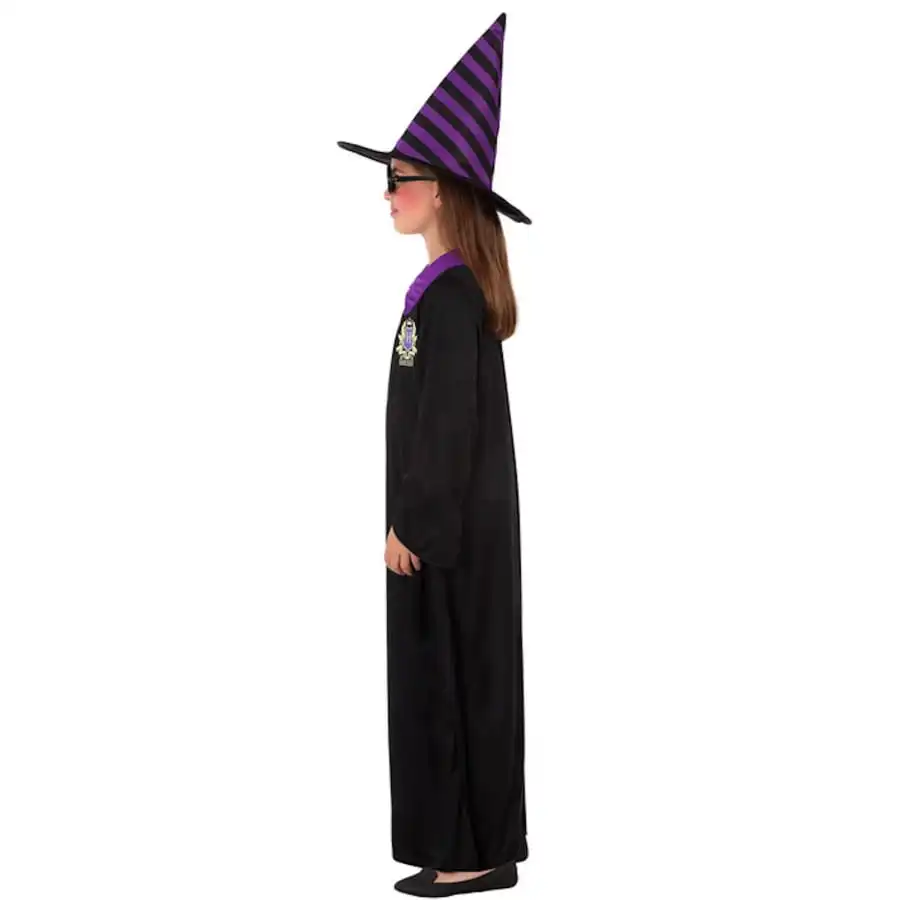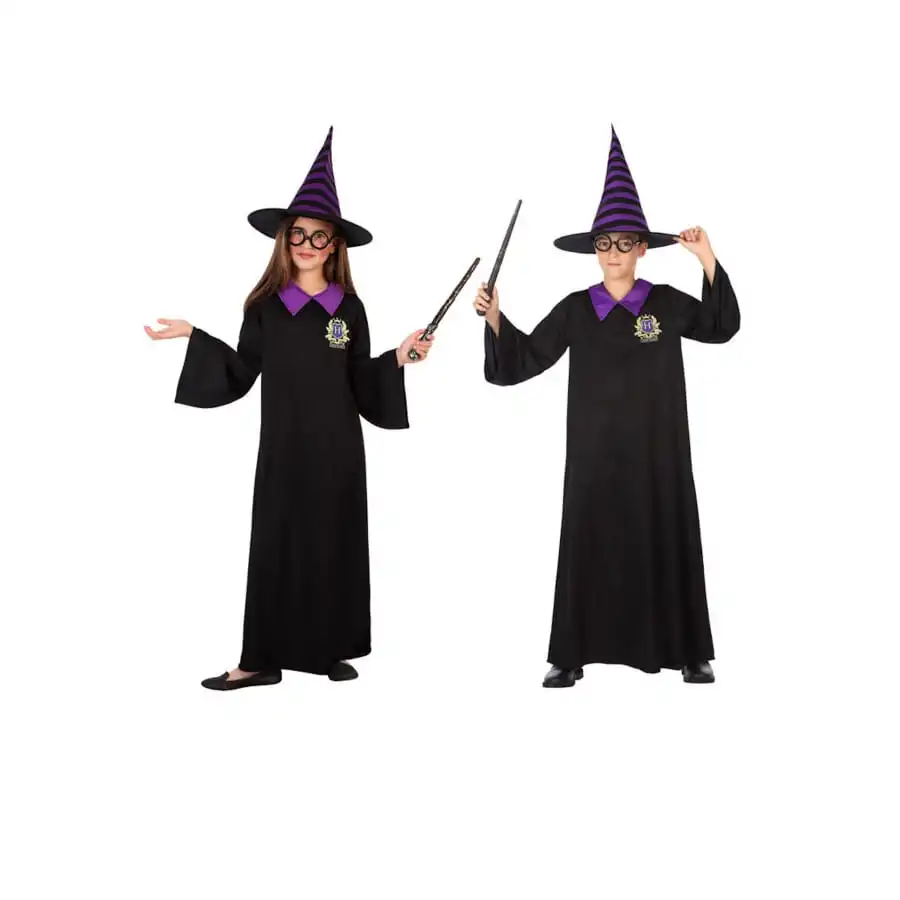 La tenue noire de petit sorcier avec col violet conviendra aussi bien aux garçons qu’aux filles.