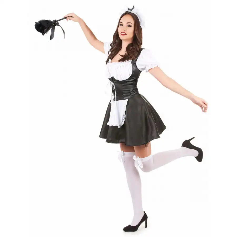 Soyez une coquette femme de chambre la nuit de la Saint Valentin avec cette tenue sexy de soubrette, pour adulte. Elle se compose d’une minirobe en noir et blanc, dont le haut est constitué d’un faux chemisier blanc à fronces qui souligne la poitrine, décolleté, à manches en ballon. Sur la poitrine vient se superposer un faux gilet noir qui va maintenir la taille grâce à des lacets blancs, et un tablier blanc bordé de feston est cousu sur le devant. Le bas de la robe est noir, d’allure bouffante grâce au jupon, et elle est très courte, ce qui rend la tenue sexy. Le serre-tête est le dernier élément de la tenue, il est garni d’une dentelle blanche en feston et d’un petit noeud noir. Retrouvez sur notre site le plumeau noir et les bas blancs, qui vont parfaire votre déguisement.