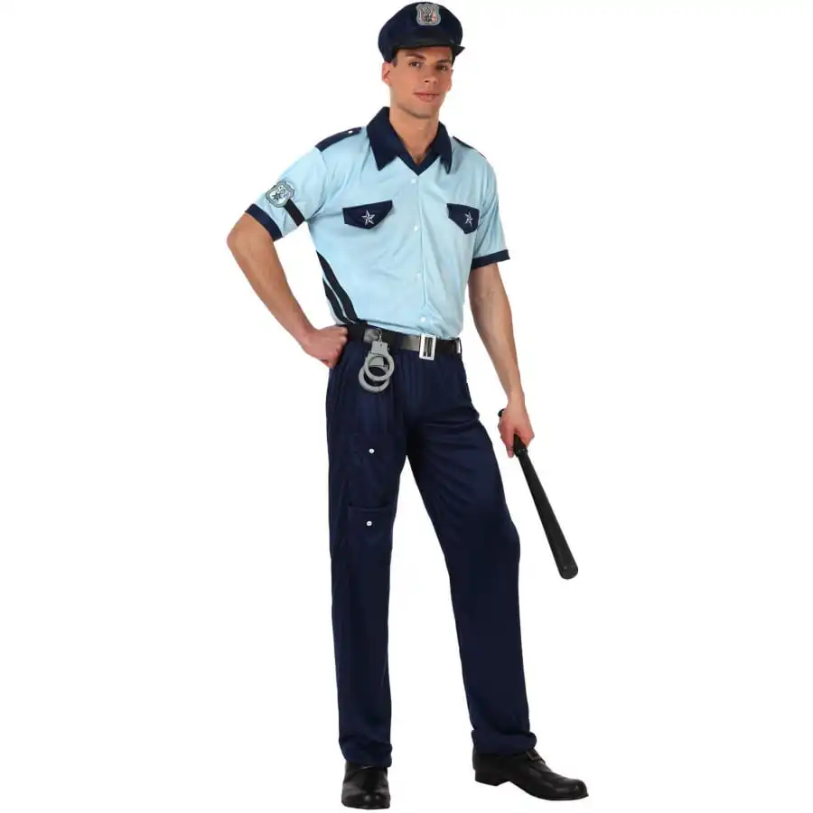 On reconnait forcĂ©ment un policier par son uniforme de travail. Si vous voulez intĂ©grer les forces de l’ordre le temps d’une soirĂ©e, il vous faudra le dĂ©guisement qui va avec. Cet uniforme de policier bleu pour homme adulte est une opportunitĂ© Ă saisir. Il s’agit d’un ensemble complet composĂ© d’un haut, d’un pantalon et de divers accessoires. Le haut est une fausse chemise Ă©lastique de couleur bleue, qui s’enfile par la tĂȘte. Elle est dotĂ©e d’un faux col, de faux boutons et de fausses poches. Le pantalon est Ă©lastique Ă la taille, de couleur bleu marine, avec insigne sur le cĂŽtĂ© et fausses poches intĂ©grĂ©es. Il sera accessoirisĂ© par une ceinture Ă boucle noire. Retrouvez aussi un tour de bras avec insigne dans le lot. Pour la touche finale, vous serez Ă©quipĂ© d’une casquette bleue avec insigne de police.